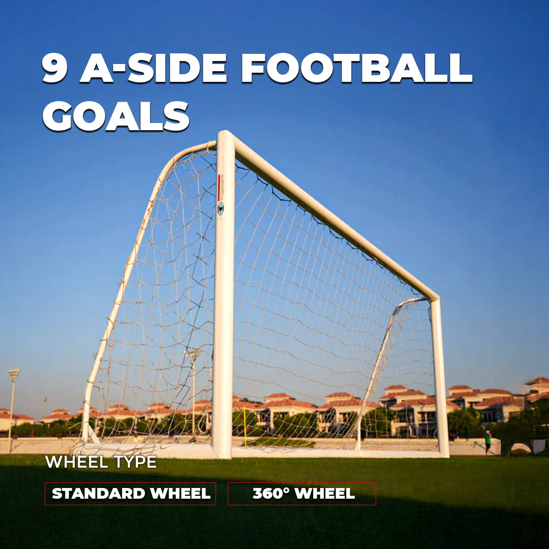 Equip your 9 a-side football pitch with our premium 9 a-side football goals. Made from high-quality aluminium, these movable football goal posts are built for durability and convenience. Available in the standard 4.83 x 2.13 meters size—these goals feature a sturdy, powder-coated white finish for longevity. With two options of "Standard Wheels" and "360° Wheels", they’re easy to transport and set up, making them perfect for training sessions or official matches.